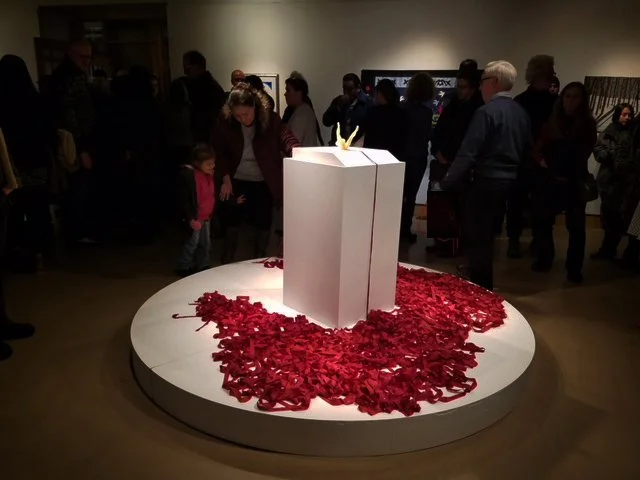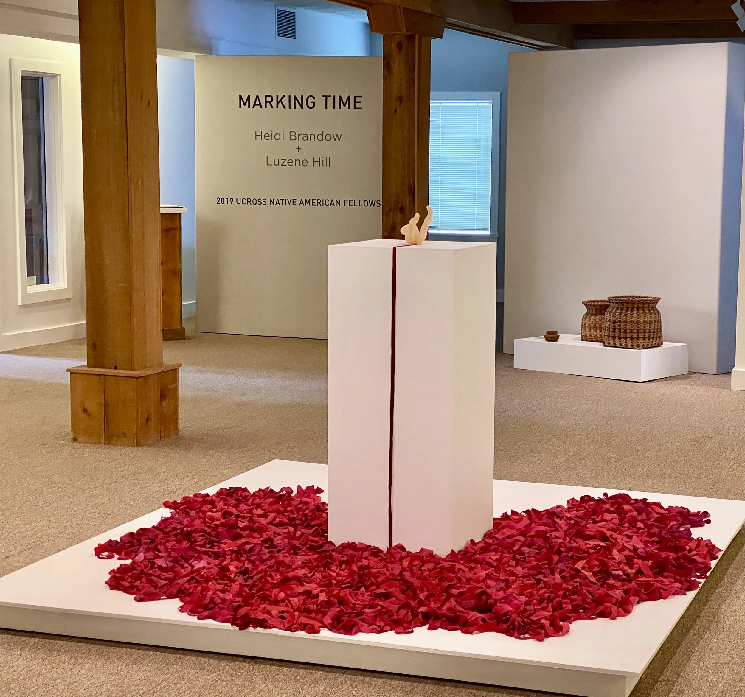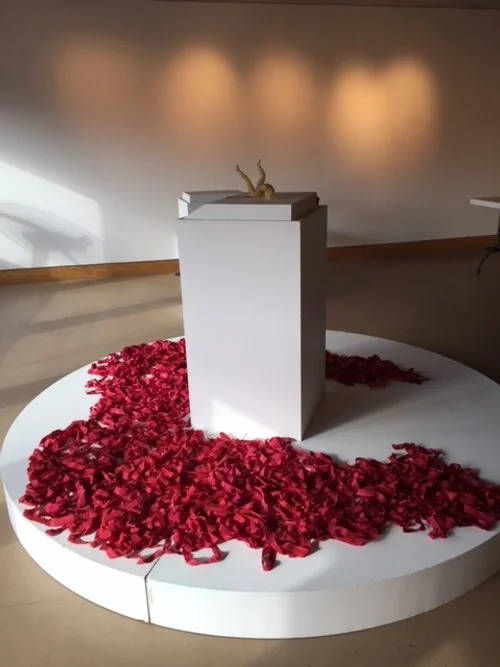 One cochineal dyed silk strip for each tribe in the US. Additional strips to be added during the exhibition will begin a reckoning for the unknown numbers of missing and murdered Native women.